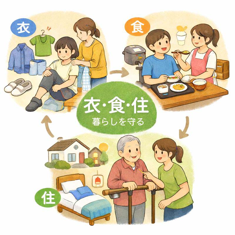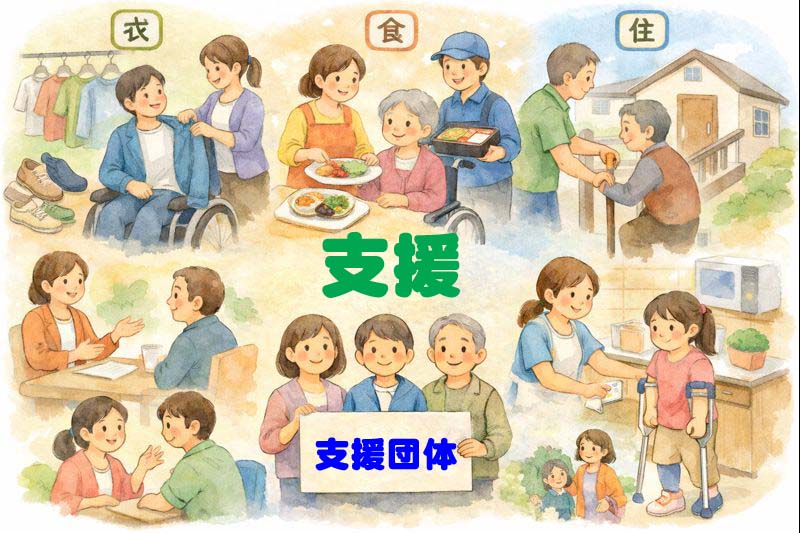 衣食住の支援とは、服を選ぶことや食事をとること、住まいを整えることを手助けする取り組みです。たとえば、着替えがしやすい衣類の情報提供、栄養に配慮した食事の配達、段差を減らした住環境の工夫などがあります。これらは医療や専門的な治療ではなく、日常生活を少し楽にするための支援です。衣食住の支援や支援団体は、生活の基盤を整える役割を担っています。